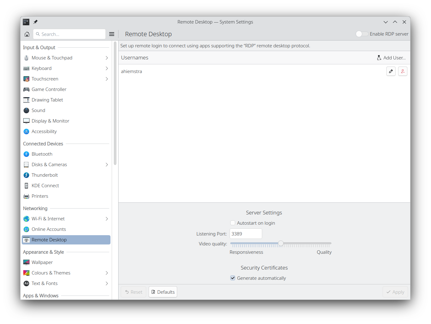 One thing that is being asked somewhat often is whether KRdp would allow a remote user to login without a currently running session. Unfortunately, currently that is not supported and there is no clear roadmap for when it will be supported. Remote login requires quite some extra infrastructure to fully work, not only in Plasma but other projects as well.